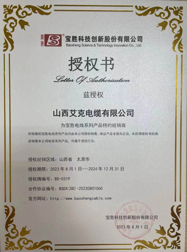 寶勝電纜山西銷售中心山西艾克電纜有限公司是寶勝電線電纜的官方授權(quán)經(jīng)銷商,授權(quán)編號BS-0319。專業(yè)經(jīng)營寶勝牌電線電纜,包括電力電纜,控制電纜,橡套電纜;硅橡膠電纜,氟塑料電纜,補(bǔ)償電纜,各種阻燃,低煙無鹵,耐火,及高溫電線電纜;架空絕緣電纜,船用電纜,礦用電纜,機(jī)車車輛電纜,計算機(jī)電纜,儀表信號電纜,高壓交聯(lián)電力電纜,低壓輻照交聯(lián)電力電纜,低壓輻射交聯(lián)控制電纜,低壓輻照交聯(lián)電纜,預(yù)分支電纜,1E級K3類核電站電纜,承荷電纜,自控溫電纜,布電纜,鋁絞線,和鋼芯鋁絞線等電線電纜產(chǎn)品。產(chǎn)品備有大量現(xiàn)貨、各種型號顏色齊全、支持配送。